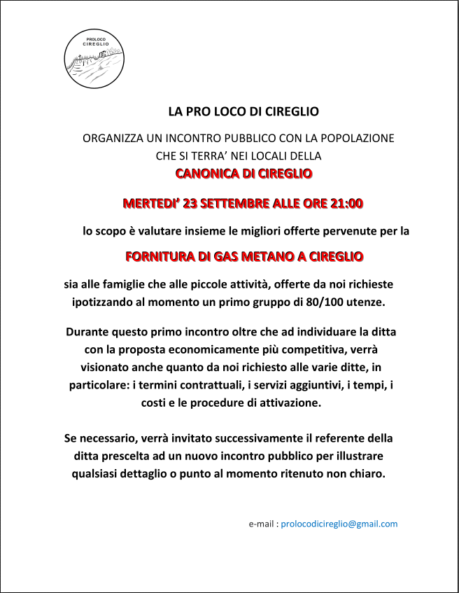 La proloco di cireglio si rinnova dopo tanti anni con l obbiettivo di migliorare il paese attraverso nuovi eventi e attraverso interventi sul territorio ed essendo sempre a disposizione dei cittadini.